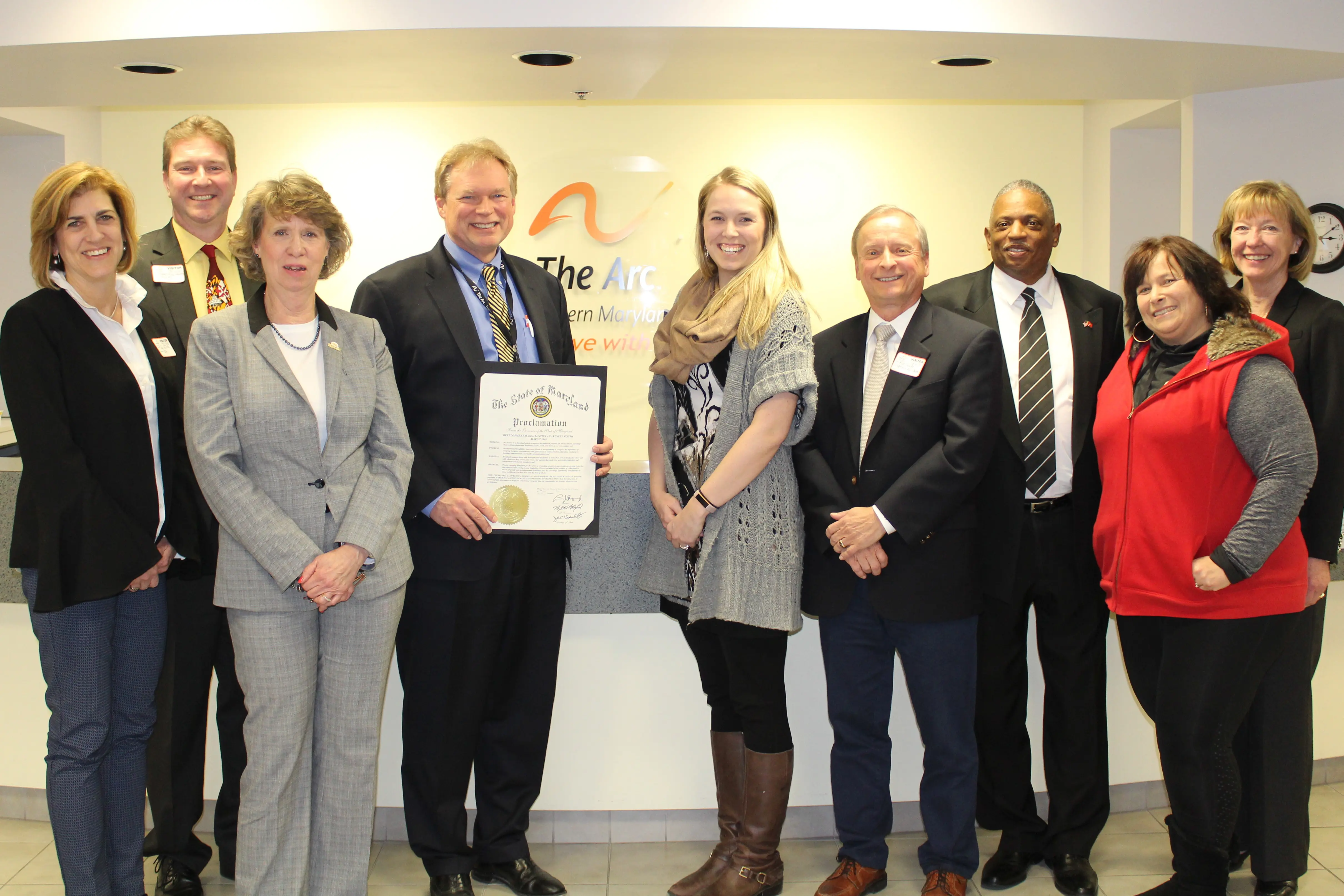 Roundtable gathers to discuss the benefits and challenges of employing people with intellectual and developmental disabilities. Secretary Carol Beatty presents The Arc Southern Maryland with a proclamation from Governor Hogan for Developmental Disabilities Awareness Month. From left to right: Judy Pattick, Regional Director, Developmental Disabilities Administration (DDA); Jim Rzepkowski, Assistant Secretary for Workforce Development & Adult Learning, Maryland Department of Labor, Licensing, and Regulation (DLLR); Carol Beatty, Secretary, Maryland Department of Disabilities; Terry Long, CEO, The Arc Southern Maryland; Ahna Miller, Community Coordinator, End Hunger; Bob Salta, Co-founder, DirectMail.com; Alan Crawley, Labor Exchange Administrator, Maryland Department of Labor, Licensing, and Regulation (DLLR); Tracy Jones, Manager, World Gym; Sue Page Assistant State Superintendent, Maryland State Department of Education Division of Rehabilitation Services (DORS)