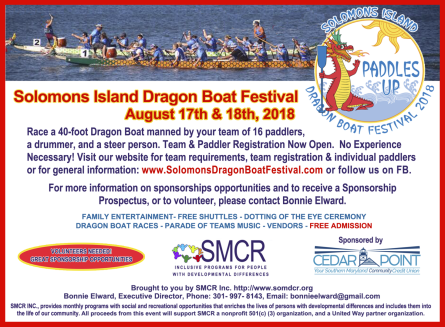 Solomons Island, Maryland Solomons Island, United StatesThe Arc is a proud Parade Sponsor of the 2018 Solomons Dragon Boat Festival, which benefits people with developmental disabilities. We will have a table at the event, located in front of the Solomons United Methodist Church on August 18th from 8am-3:30pm. Come see us!