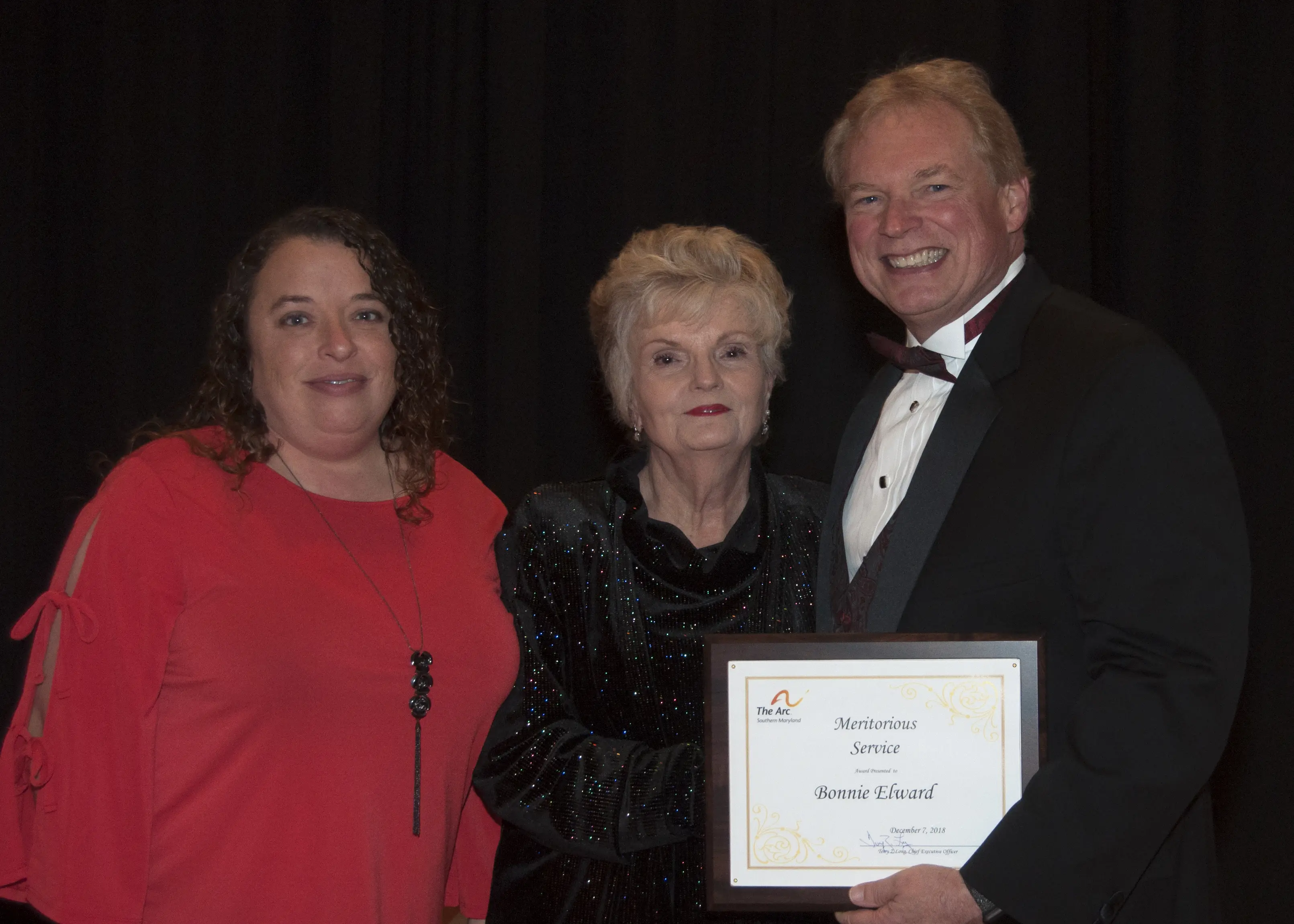 ![]() Meritorious Service Award – Bonnie Elward (center) of Southern Maryland Community Resources |